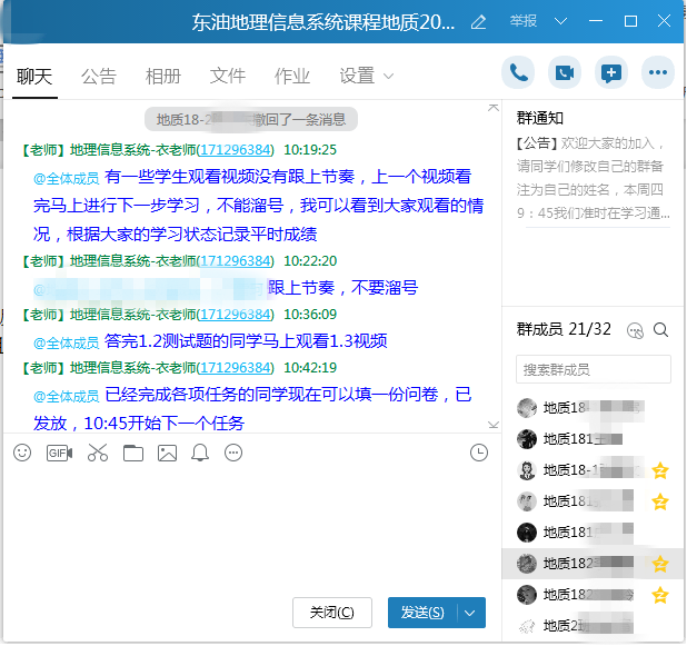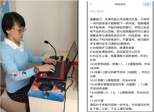 录播+直播的线上授课方式。衣伟宏老师开课前一个月参加了各种线上教学培训,选择超星学习通作为主要授课平台。相比于同类产品,其海量资源可通过首页找资料一键查找;与电脑端网络教学平台学习数据同步,包括建课数据,学习数据,课堂互动数据等等;可通过账号方式实名登录,可进行网络社交。结合课程内容并考虑居家网络条件,最终采用“超星学习通+QQ直播”形式开展线上授课。使用学习通发布录播视频,为避免学习通上课高峰时崩溃,制定了使用QQ群直播的预案。