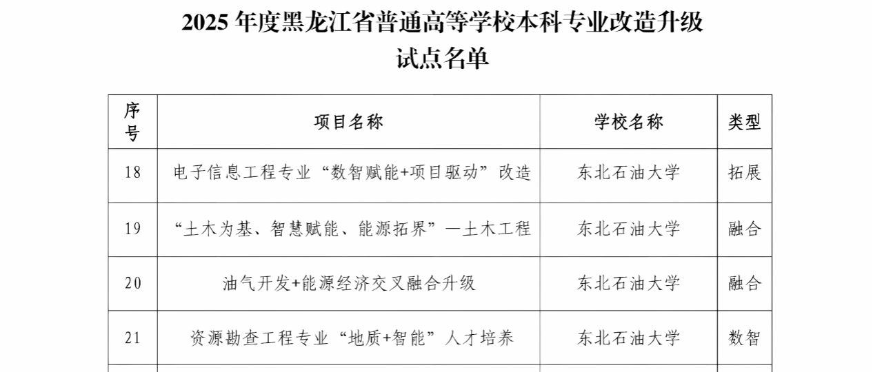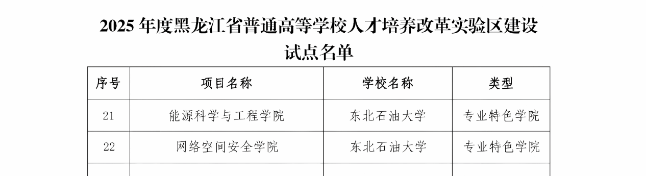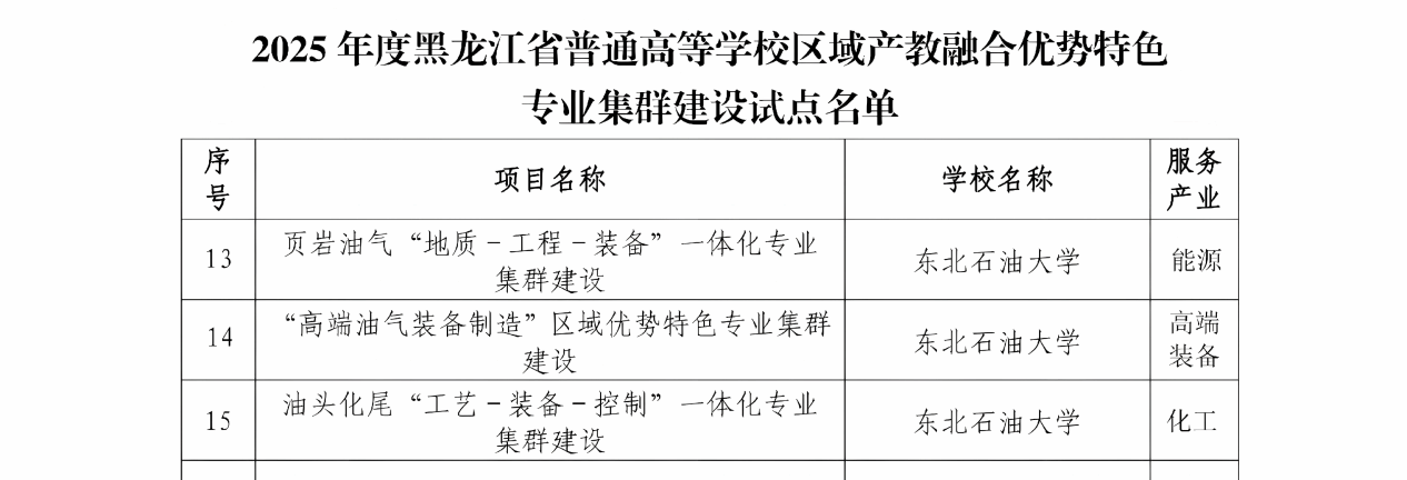 近日,黑龙江省教育厅发布《关于开展高等教育综合改革首批试点的通知》。我院地质资源与地质工程学科相关领域入选全省“101计划”增补试点项目、资源勘查工程专业入选首批本科专业数智升级改造试点项目。此外,我院支撑页岩油气“地质-工程-装备”一体化专业集群入选全省区域产教融合优势特色专业集群建设试点项目、能源科学与工程学院入选全省人才培养改革实验区建设试点项目