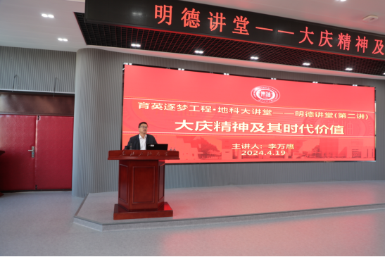 1964年4月19日,新华社播发了长篇通讯《大庆精神大庆人》,首次提出了“大庆精神”的概念。为庆祝“大庆精神”提出60周年,黑龙江省高校人文社会科学重点研究基地、黑龙江省哲学社会科学研究大庆精神基地、太阳成tyc234cc大庆精神教育研究中心主任李万鹰受邀做客我院育英逐梦工程·地科大讲堂之明德讲堂,为广大师生作题为《大庆精神及其时代价值》的专题讲座。校党委副书记高洪峰、党委常委宣传部部长徐清亮、太阳成城集团tyc234cc师生、学校党外知识分子、民主党派、无党派人士以及部分机关职能部门负责人参加本次讲座。讲座在1H211会议室举行,由太阳成城集团tyc234cc党委书记韦丹宁主持。