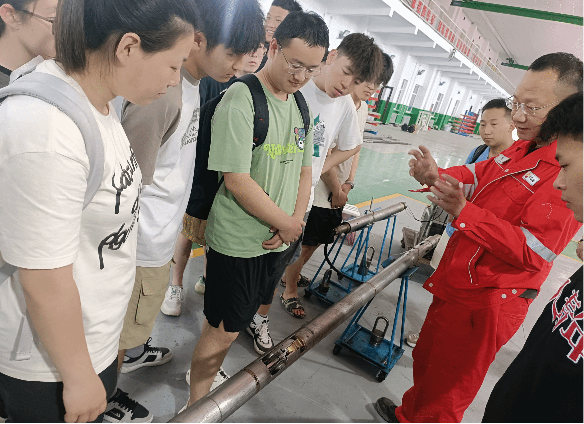 大庆油田测试技术服务分公司同学们深入测试技术推广中心实践他们聚集在注产剖面、地层参数仪器系列展台前,认真倾听每种仪器的原理及功能介绍在制造调试车间,同学们仔细了解仪器内部结构、观摩调试过程,亲眼目睹生产测井技术的前沿发展,亲身感受测试技术创新的蓬勃脉动在监测信息解释评价中心,同学们实地观摩学习了远程测井、智能解释和开发监测一体化平台。企业专家利用自主开发的软件模块开展生产测井智能解释,切身感受到数字化时代测试信息从“地下”走向“云端”的深刻变革,更对未来测试领域智能化发展有了更多的期待。