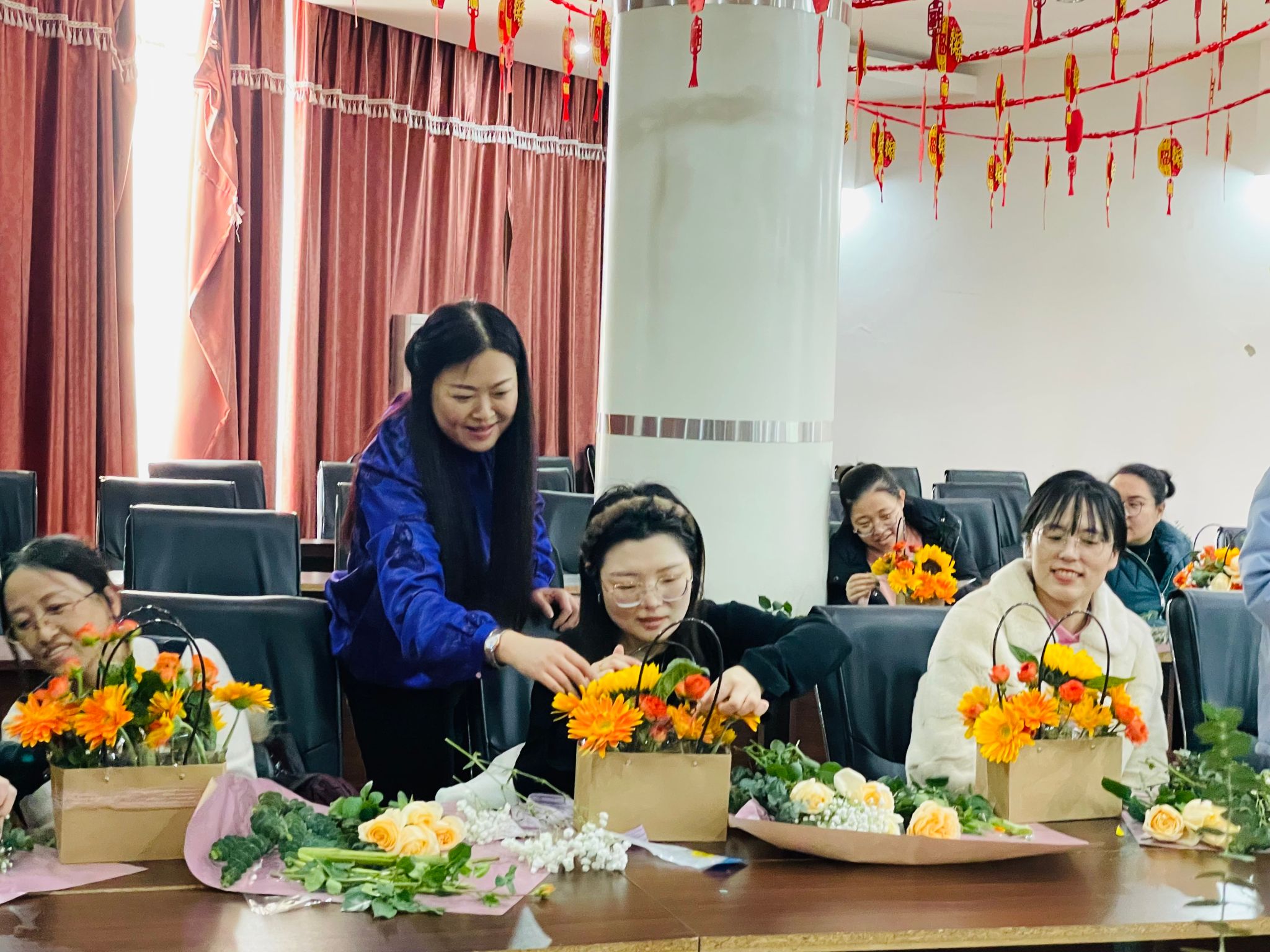 随后的插花环节将活动推向高潮。董教授为大家讲解了鲜花品种、色彩搭配、插花技巧等知识,并进行了细致的现场演示。在董教授的悉心指导下,老师们充分发挥创意,凭借色彩搭配、层次布局以及精心修剪,一件件独具匠心、令人赏心悦目的插花作品逐步诞生。活动现场,老师们相互交流插花心得、分享创作喜悦,现场弥漫着鲜花的芬芳和浓浓的节日气息。