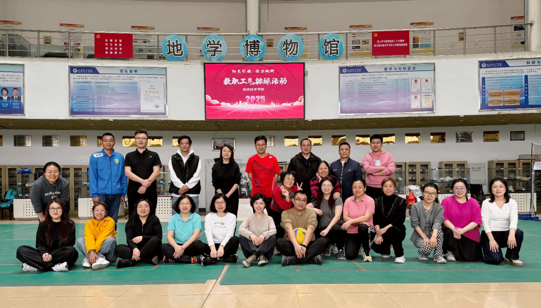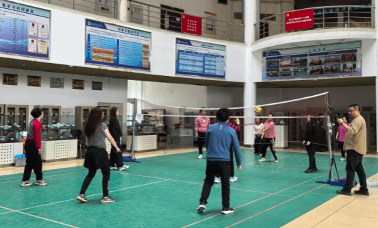 在五一国际劳动节来临之际,为传承红色精神,凝聚奋进力量,展现教职工的青春活力与协作能力,4月30日下午,学院在一楼场地举办了“红色引领·活力地科”气排球活动,全体在馆教师参加活动。