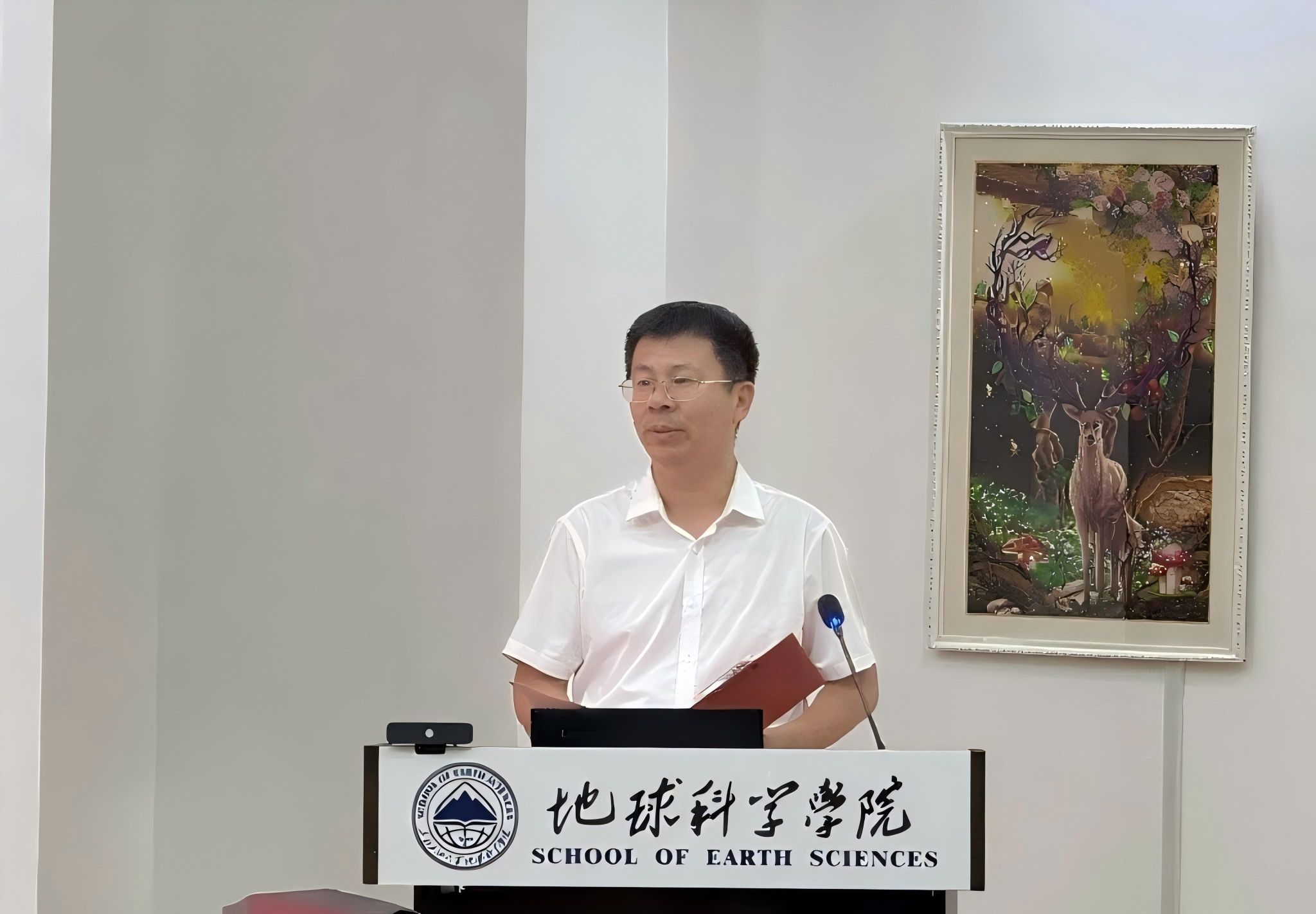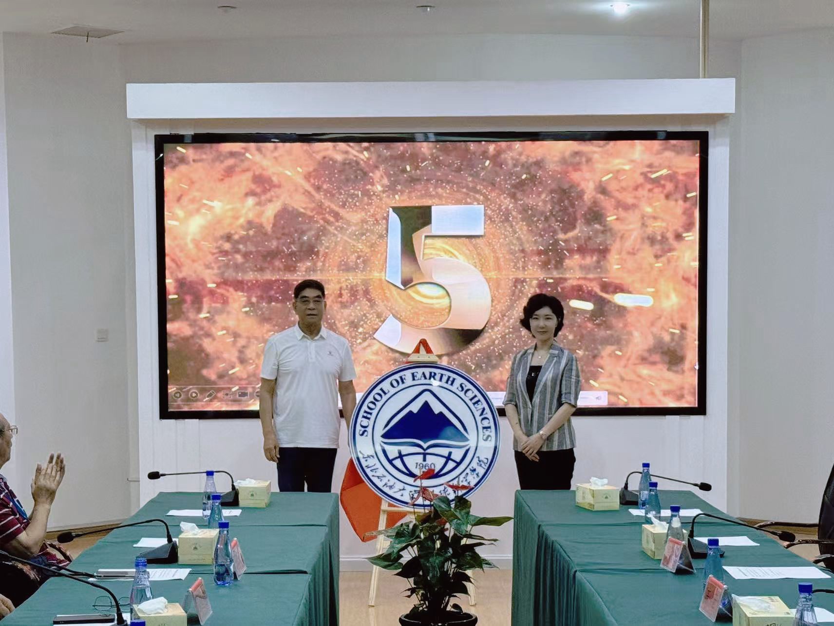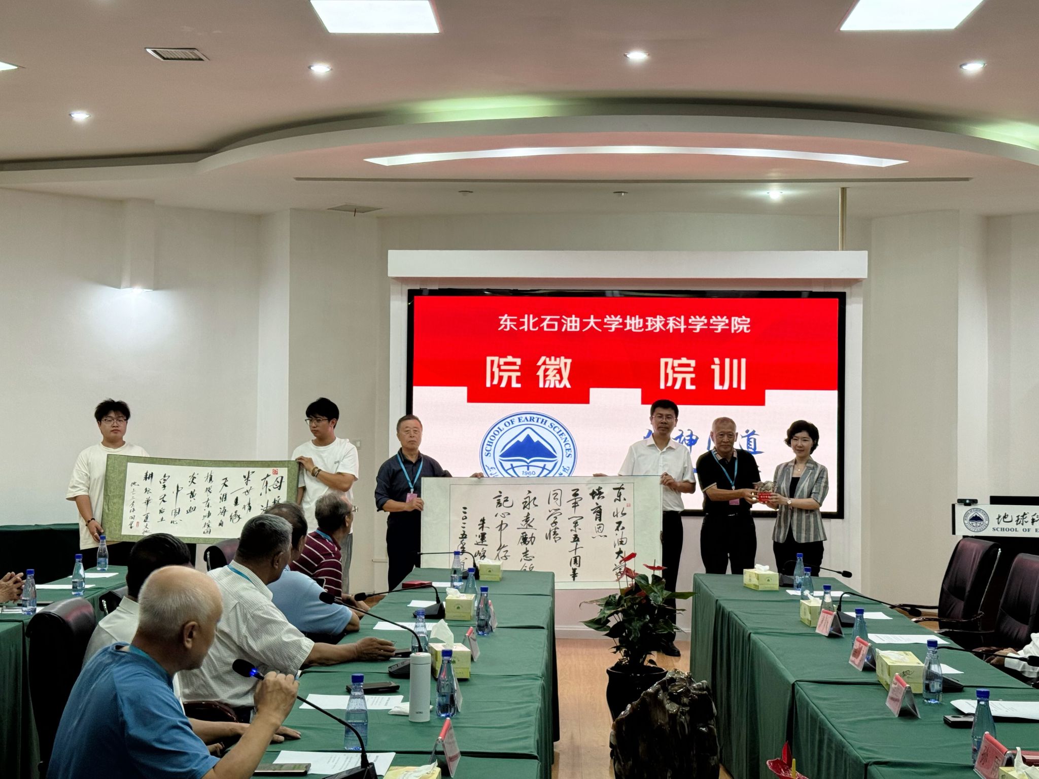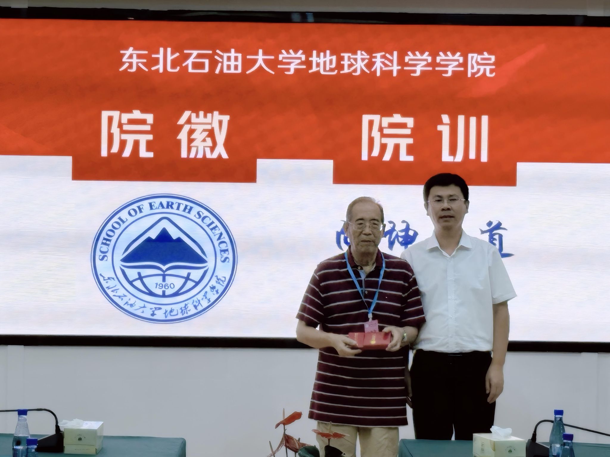 在与会人员的热烈期待中,优秀校友代表、中石化原董事长傅成玉与院党委书记韦丹宁共同为院徽揭幕。伴随着倒计时声,红色幕布徐徐揭开,院徽正式亮相。其融合油滴、山峰、书本、经纬线及“1960”等核心元素,象征学院在地地球科学领域的探索精神和学术使命,现场反响热烈。