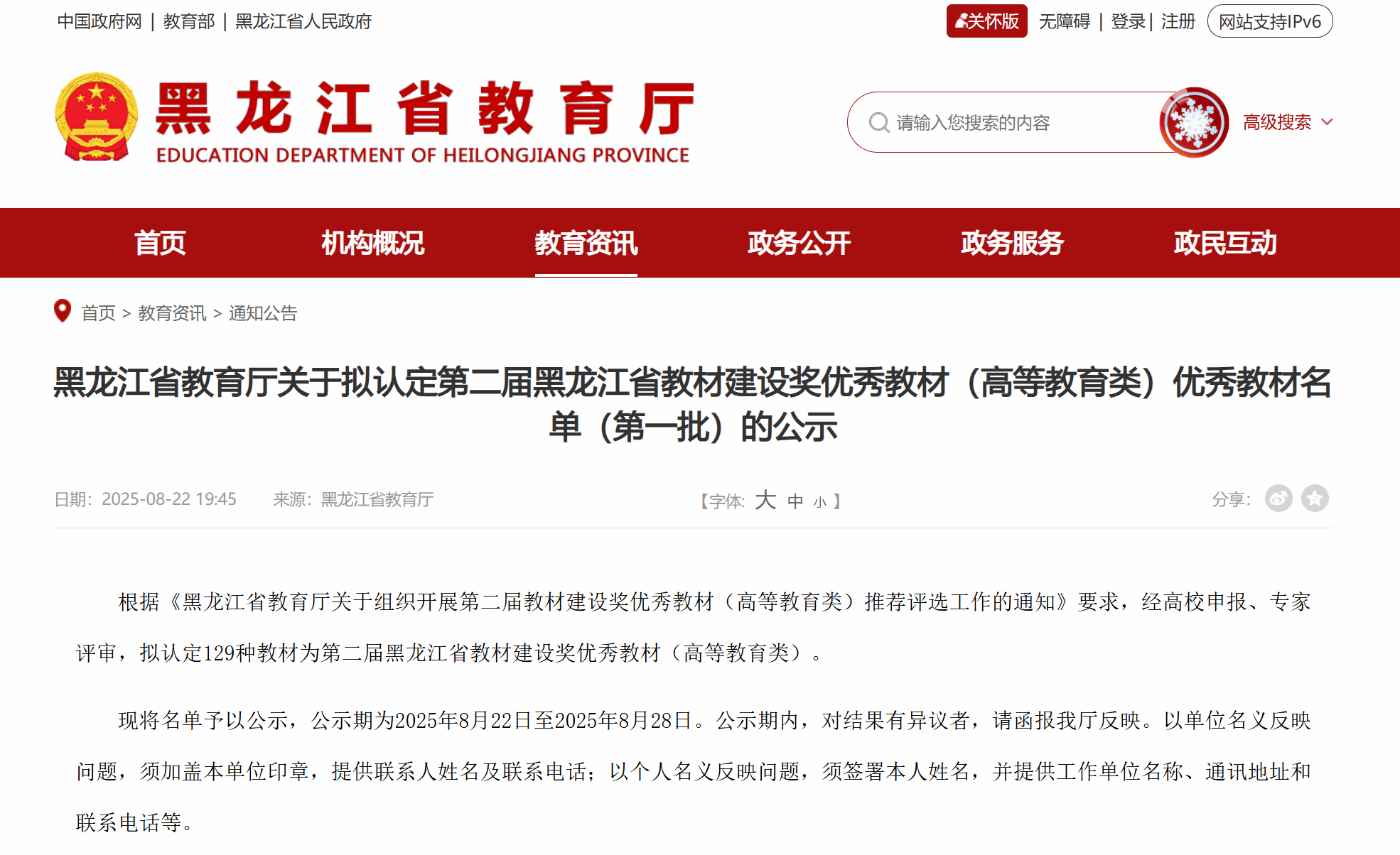 近日,黑龙江省教育厅发布了《关于拟认定第二届黑龙江省教材建设奖优秀教材(高等教育类)名单(第一批)的公示》,经各高校申报、专家严格评审,全省共评选出30部获奖研究生优秀教材(其中特等奖3部、一等奖10部、二等奖17部),我院有1部教材荣获省级研究生优秀教材一等奖。