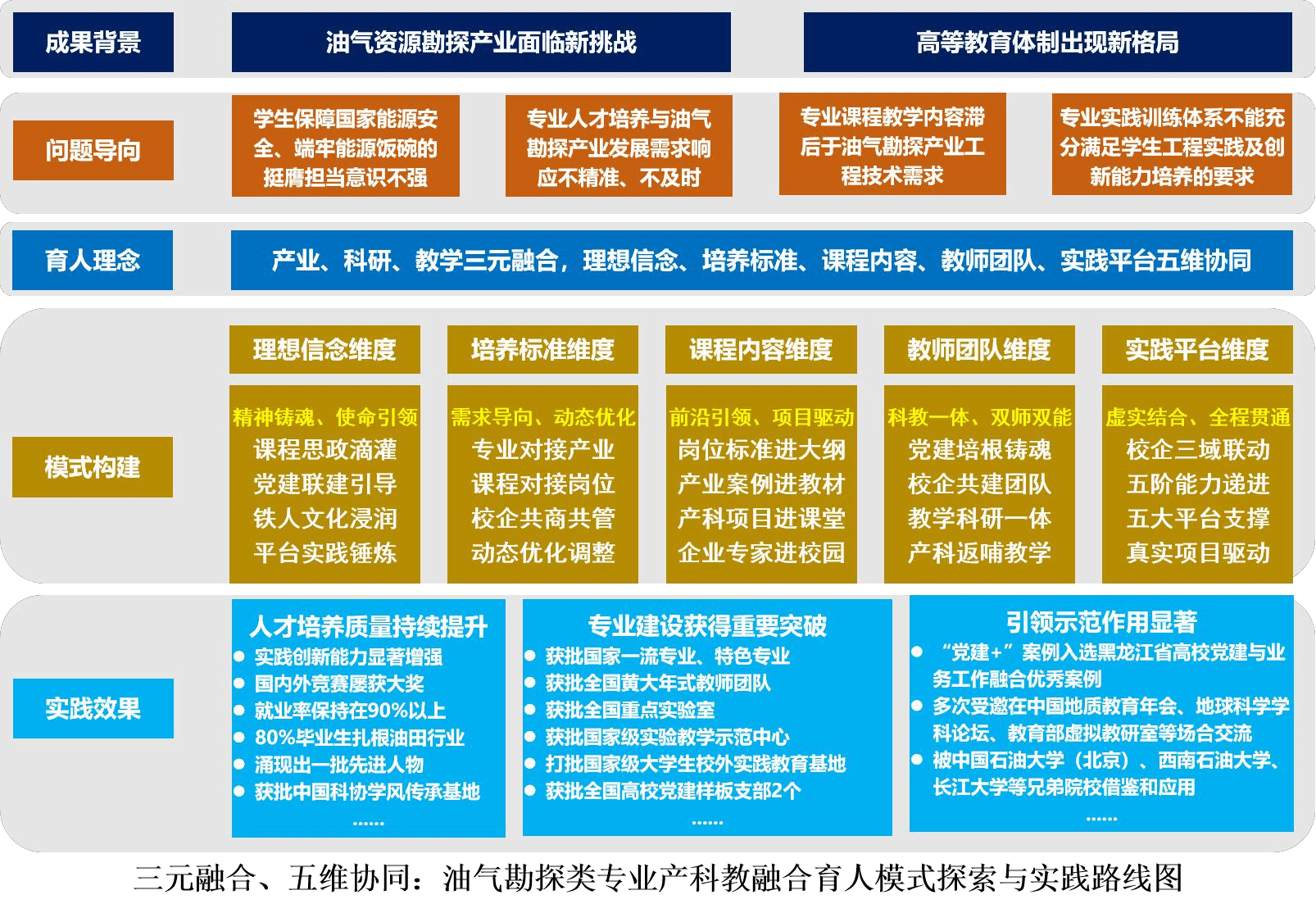 面对产业新形势和高等教育新格局,太阳成tyc234cc依托油气勘探类优势专业65年的办学积淀,自2010年起以国家特色专业建设和黑龙江省专业综合改革为契机,充分发挥扎根大庆油田的区位优势,聚焦人才培养与产业需求精准对接,紧扣立德树人根本任务,整合校企双方优质资源,创新构建并实践了“三元融合、五维协同”的产科教融合育人新模式。该模式以产业、科研、教学三大要素深度融合为驱动,以理想信念、培养标准、课程内容、教师团队、实践平台五个维度协同共建为路径,系统构建产教融合、科教融汇系统育人新生态,着力培养堪当民族复兴大任、勇担能源强国使命的时代新人,为端牢国家能源饭碗提供坚实人才支撑。