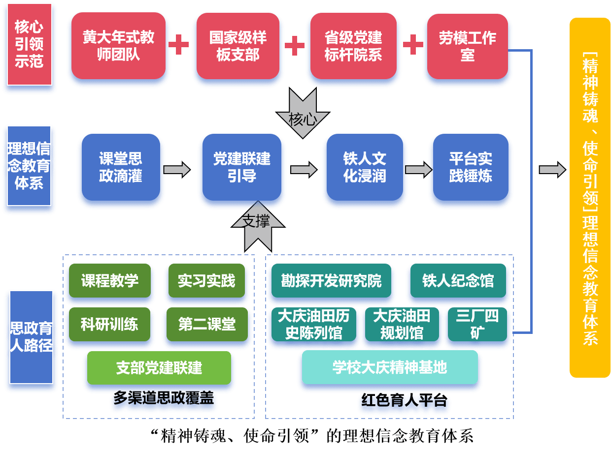 突破传统思政教育模式,实施“育英筑梦工程”,创建“课堂思政滴灌+党建联建引导+铁人文化浸润+平台实践锤炼”四维融合的育人体系。依托全国高校黄大年式教师团队,将能源战略融入专业教学;以全国样板支部为引领,形成“党建带团建、团建促班建”育人链条;整合大庆油田红色资源,实现“铁人身边学铁人”;借助校内外实践平台,将理想信念教育嵌入产科教融合全过程。成果有效破解了思政与专业教育"两张皮"难题,形成“价值引领-文化熏陶-实践升华”良性循环,夯实了学生"端牢能源饭碗"的使命担当。