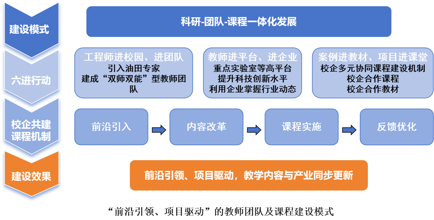 推进“科研-团队-课程”一体化建设,实施“六进”行动计划:工程师进校园、进团队,聘请52名油田技术专家,打造“双师双能型”教学队伍;教师进平台、进企业,依托全国重点实验室等科研高地追踪科技前沿,借助大庆油田等龙头企业提升工程实践能力;案例进教材、项目进课堂,构建校企协同课程开发机制,重塑教学内容体系,建设具有“两性一度”特征的高质量课程,建成国家级一流课程7门、校企共建课程28门、合作编写教材13部。