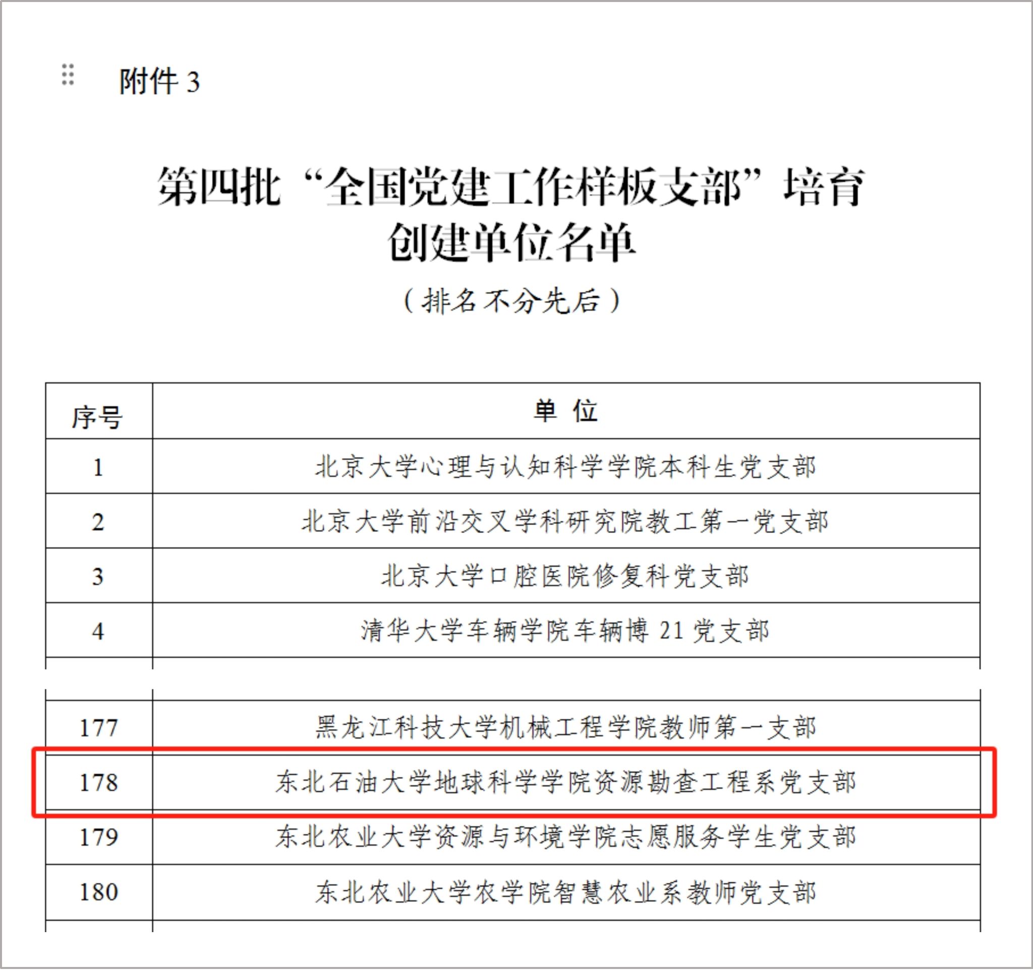 (通讯员 周全 记者 吕鸿浩)近日,教育部办公厅公布了第四批全国党建工作示范高校、标杆院系、样板支部培育创建单位名单,我院资源勘查工程系党支部入选样板支部培育创建单位。目前我校共有4个党支部先后入选全国党建工作样板支部。