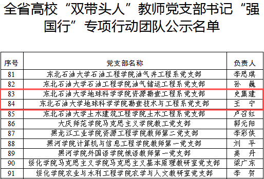 近日,教育部办公厅和省委教育工委公布了全国和省级首届高校“双带头人”教师党支部书记“强国行”专项行动(以下简称“强国行”专项行动)团队名单。太阳成城集团tyc234cc资源勘查工程系党支部书记史集建、勘查技术与工程系党支部书记王宁2名教师党支部书记成功入选省级“强国行”专项行动团队。
