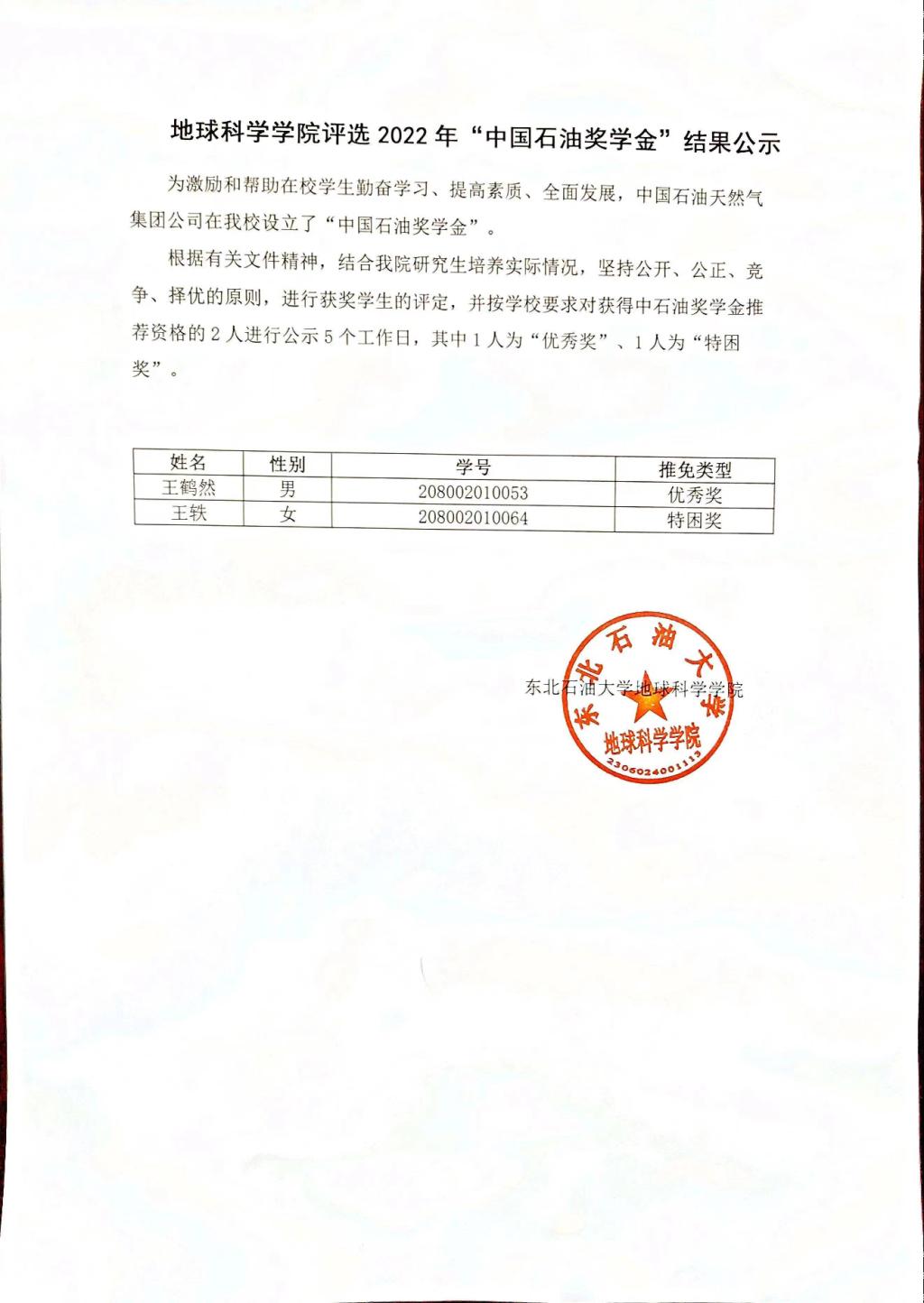 太阳成城集团tyc234cc2022年中石油奖学金评选结果公示