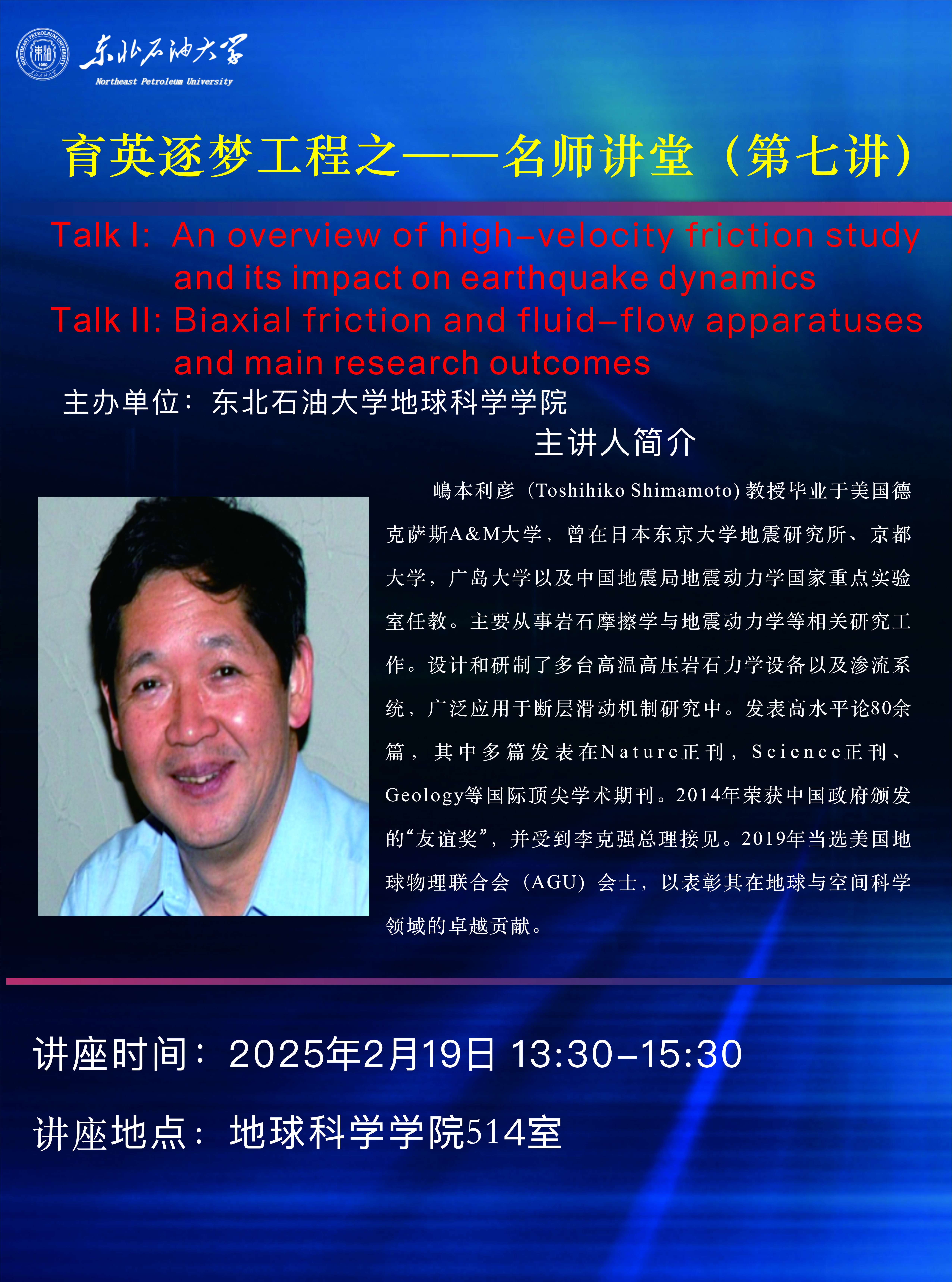名师讲堂(第七讲)——An overview of high-velocity friction studyand its impact on earthguake dynamics & Biaxial friction and fluid-flow apparatusesand main research outcomes